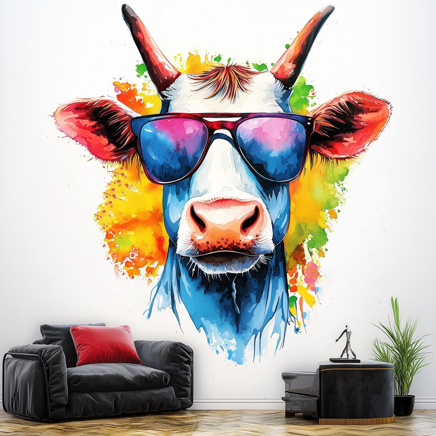 Cooles Wandtattoo „Kuh mit Sonnenbrille“ | Bunter Aquarell-Splash-Art-Aufkleber | Lustiges Kinderzimmerdekor | Fotorealistische Wandtattoos mit Tieren