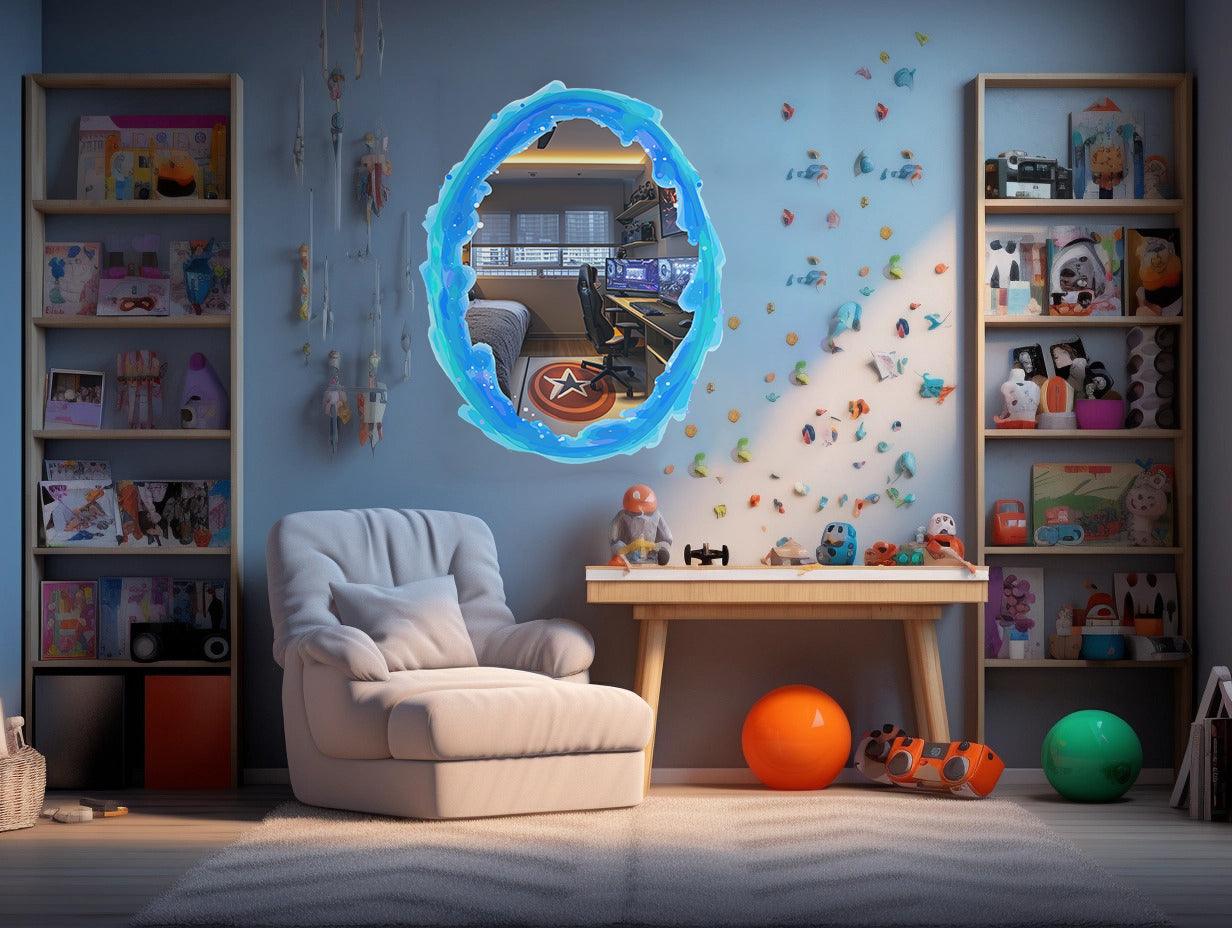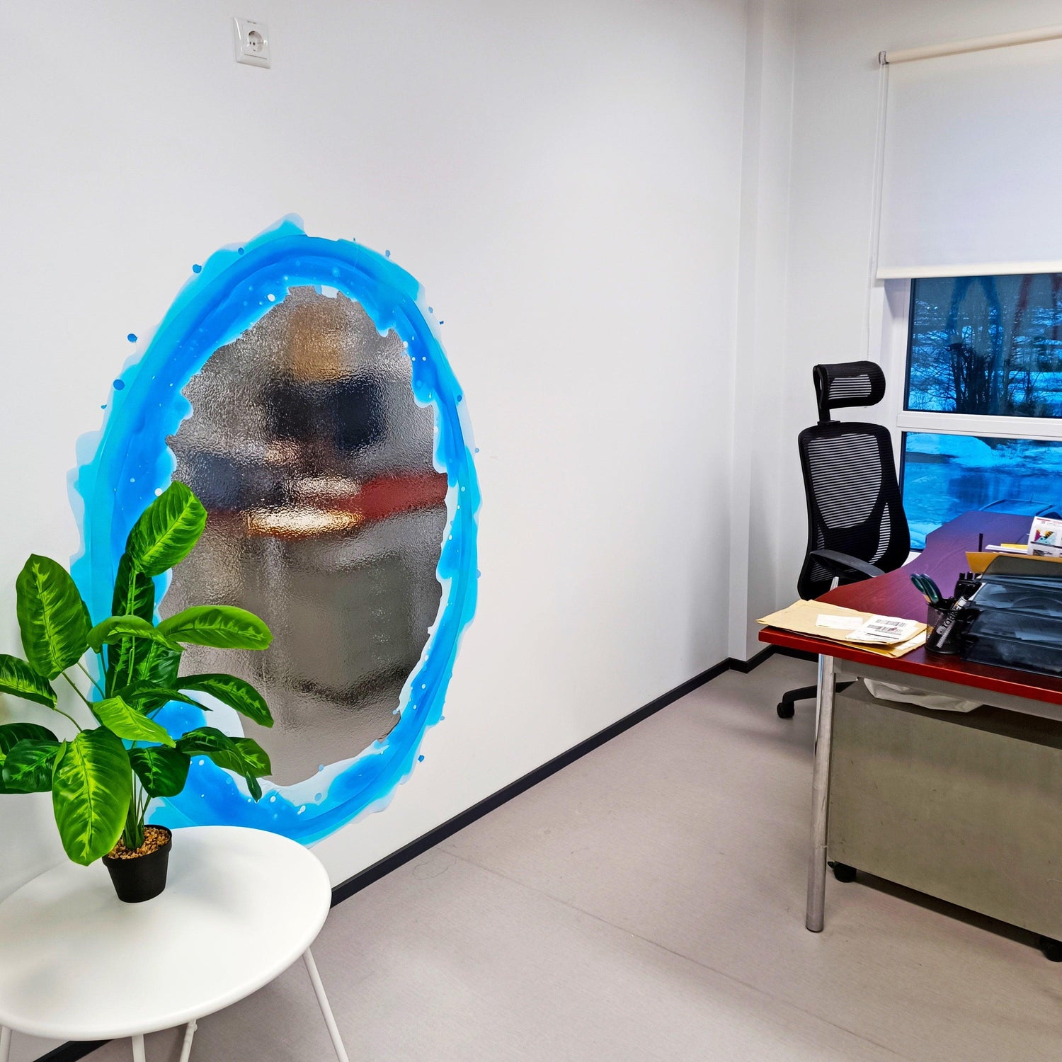 Verwandeln Sie Ihr Spiel- oder Computerzimmer in ein Portal futuristischer Fantasie mit unseren blau-orangen Portal-Aura-Wandaufklebern mit innovativem Silber-Chrom-Spiegeleffekt. Dieser einzigartige Stil umfasst einen zusätzlichen ovalen Silber-Chrom-Aufkleber, der einen faszinierenden Spiegeleffekt an Ihrer Wand erzeugt.
