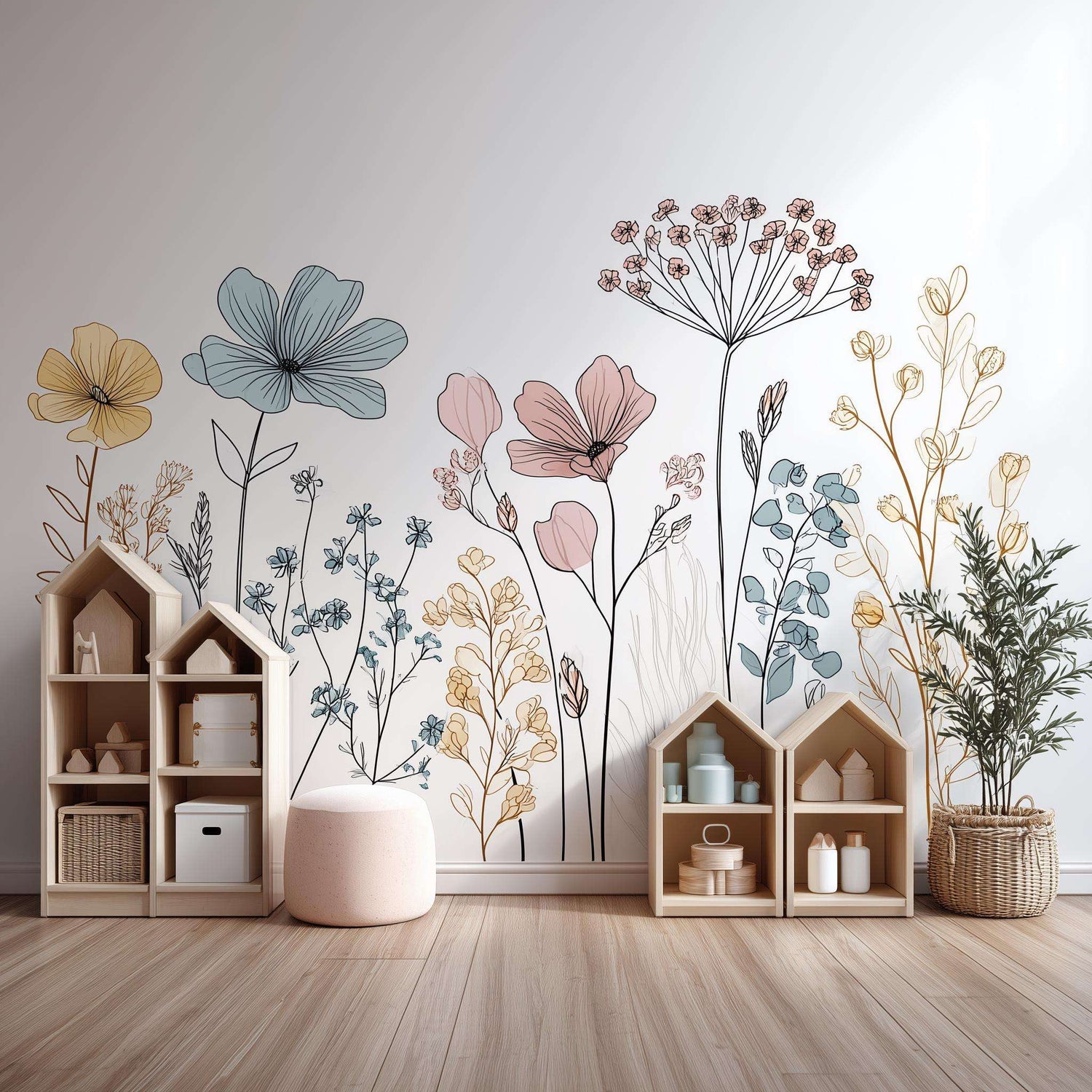 Featuring elegant hand-drawn flowers in soft, earthy tones, this oversized wall decal transforms any room into a peaceful retreat. The design combines minimalist botanical line work with delicate pastel shades, perfect for modern nurseries, kids’ rooms, or cozy reading corners.