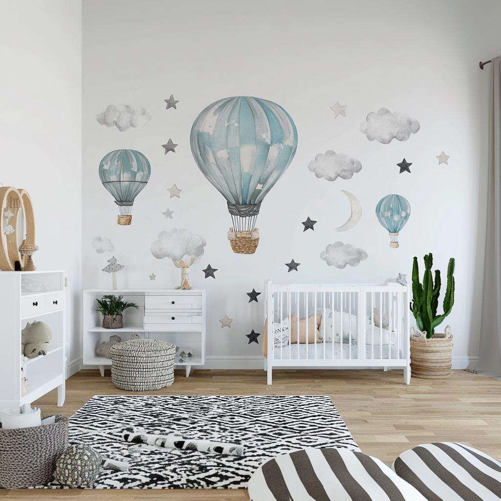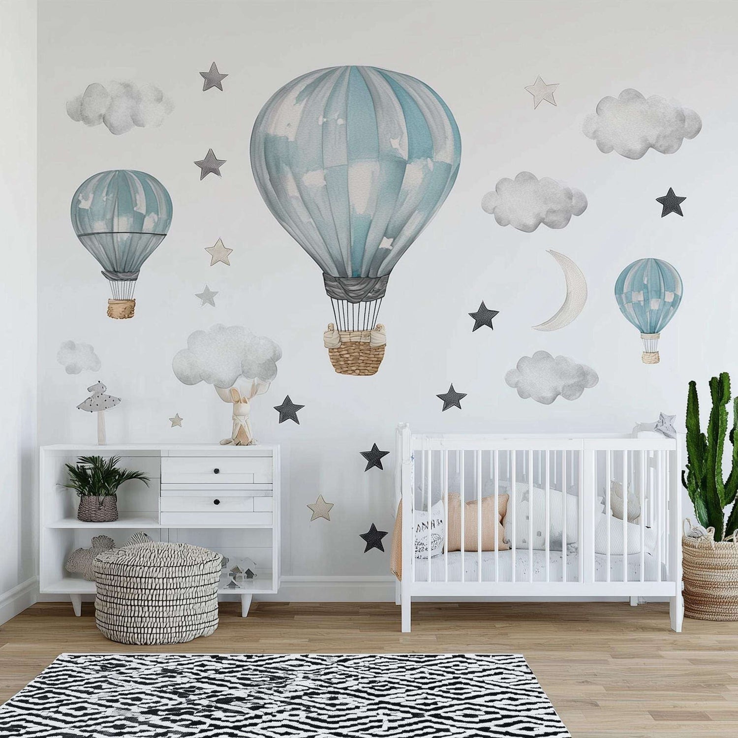 Hot Air Balloon Wall Decals | Nursery Wall Stickers | Dreamy Sky Wall Decor with Stars, Clouds & Moon | Baby Room Vinyl Decal Set