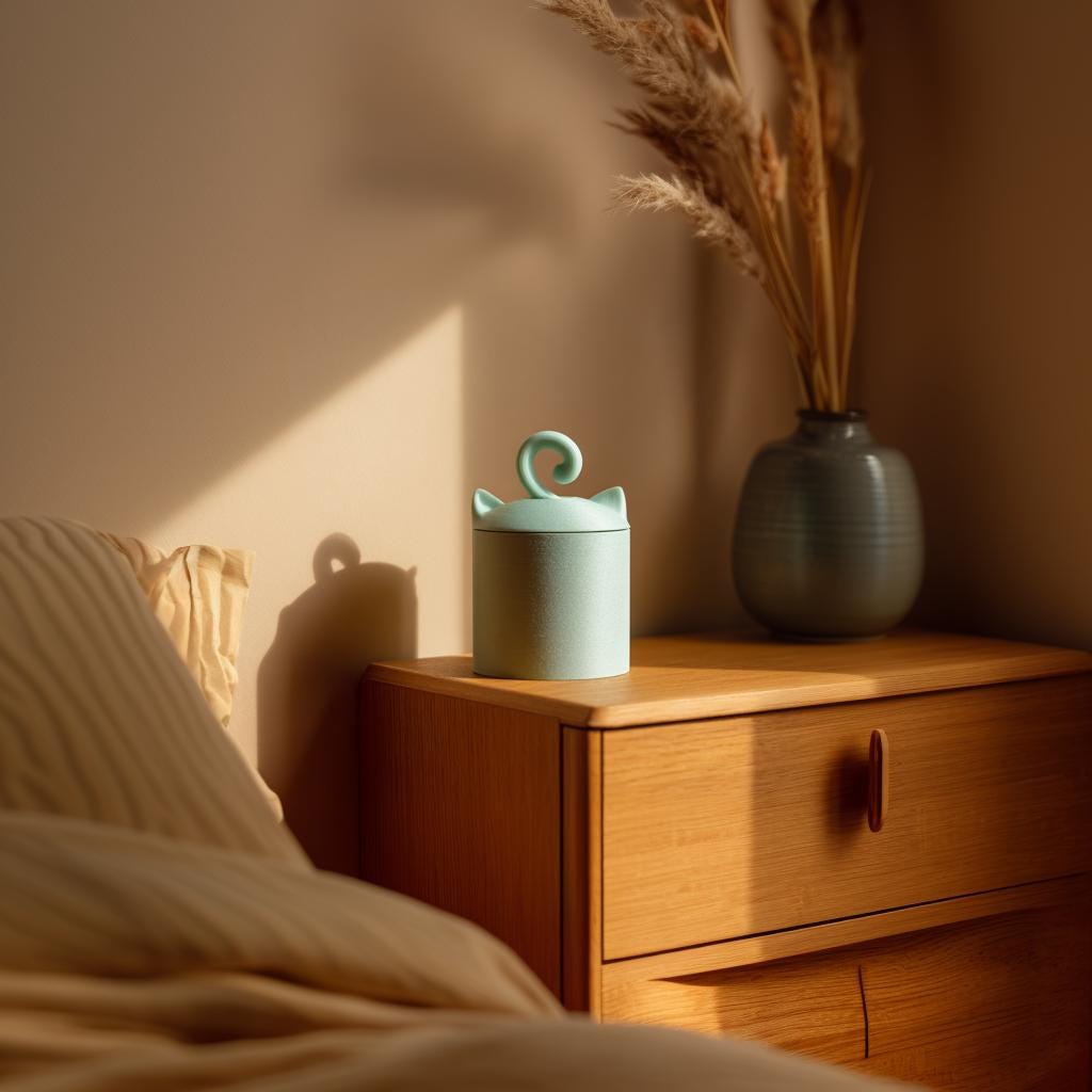 Cute minimalist 3D printed pet cremation urn with cat ears and curled tail lid handle, displayed on a wooden cabinet in warm light.
