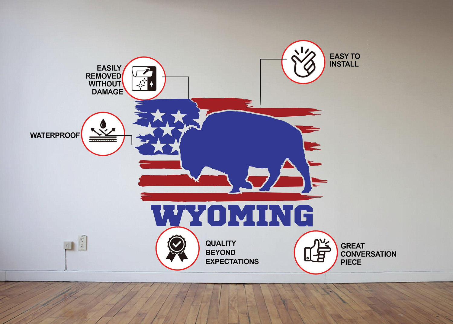 Wyoming wall decal featuring a bull silhouette and American flag design, ideal for home decor.