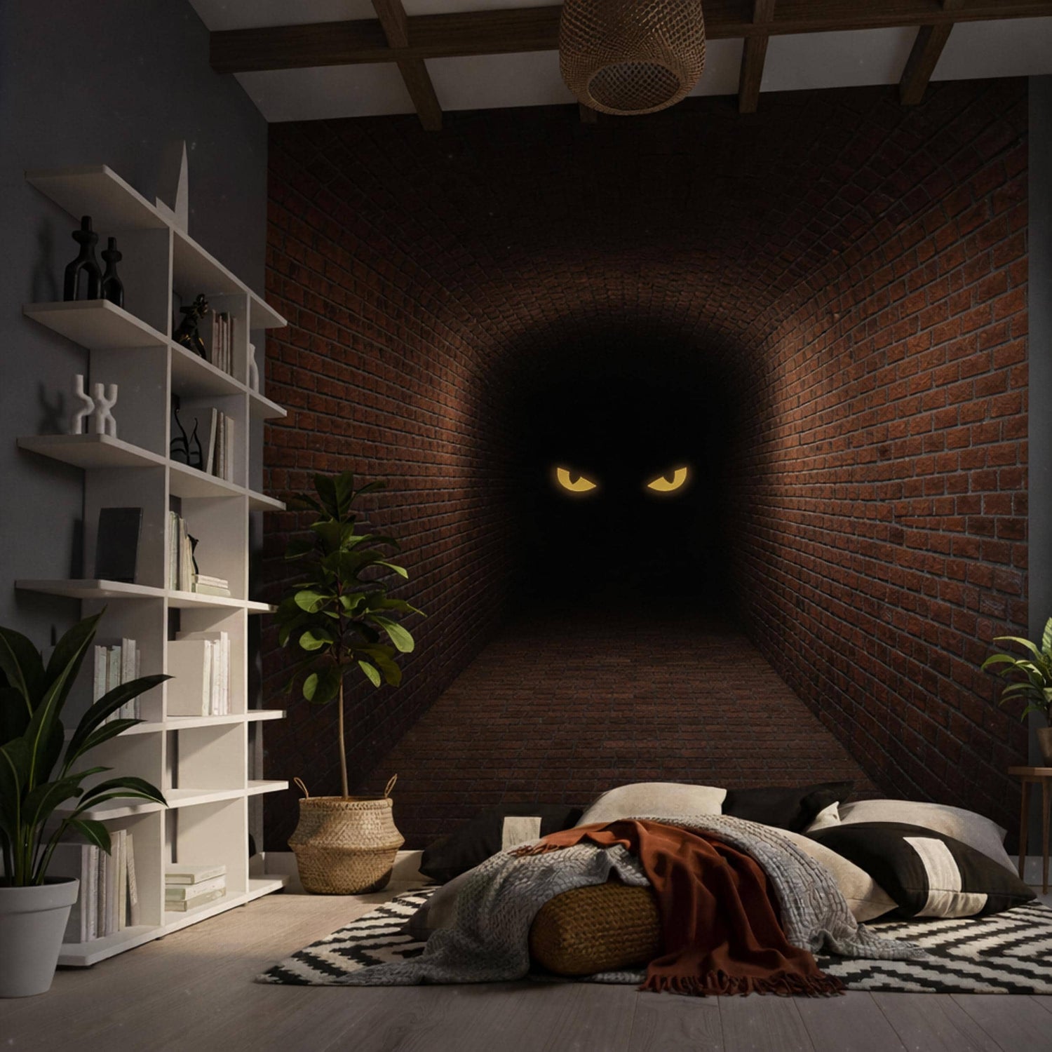 Add an eerie sense of infinite depth to your space. This high-impact 3D decal features a long, dimly lit brick hallway that seems to stretch far beyond your wall, ending with a pair of glowing yellow eyes watching from the darkness. It is the ultimate atmospheric piece for fans of the macabre and mystery.