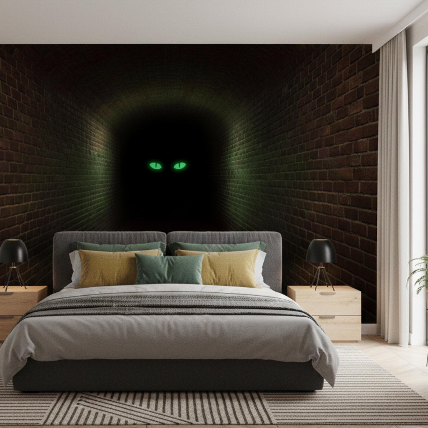 Step into the shadows... if you dare. This high-impact 3D decal features a long, dimly lit brick hallway that seems to stretch deep into your wall, ending with a pair of piercing green eyes watching from the darkness. It is the ultimate atmospheric piece for fans of horror, mystery, and gothic decor.