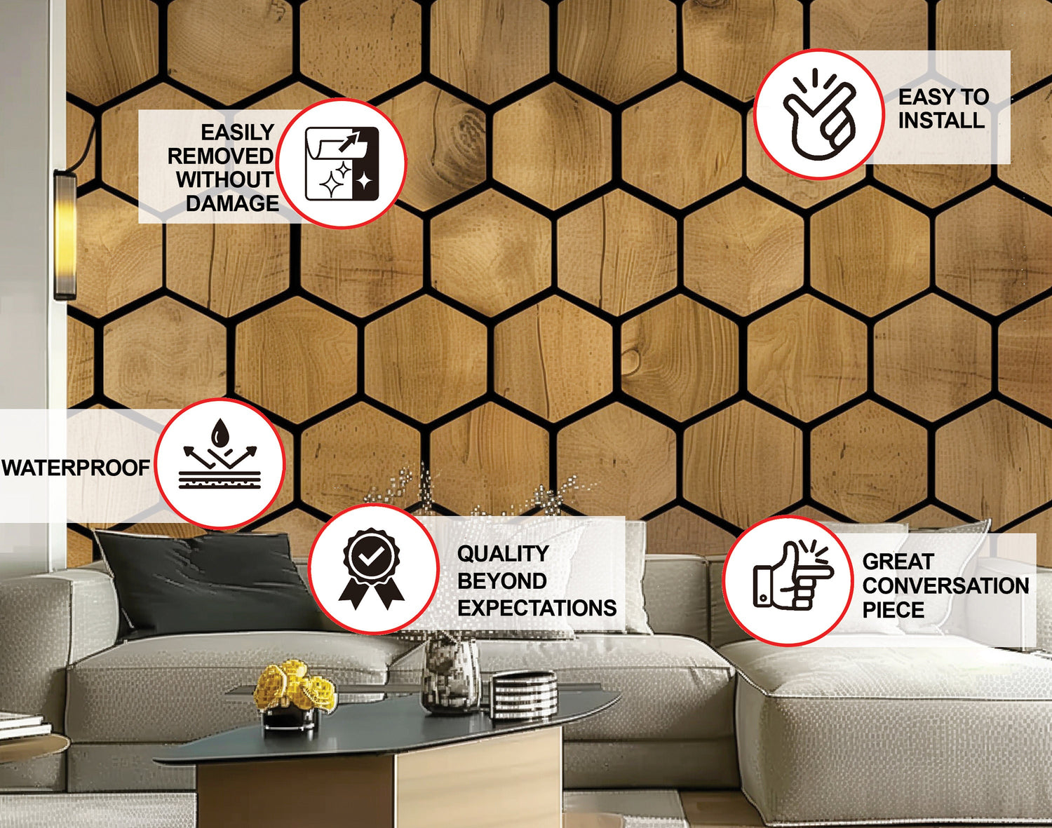 Verwandeln Sie Ihren Raum mit unseren atemberaubenden Hexagon-Wandaufklebern, der perfekten Mischung aus modernem Stil und natürlicher Ästhetik. Jeder Aufkleber zeigt ein anspruchsvolles Holzdesign, elegant eingerahmt von einem glatten schwarzen Hintergrund, wodurch ein einzigartiges Wabenmuster entsteht, das jeden Raum aufwertet. Unsere selbstklebende Tapete ist für einfaches Anbringen und Entfernen konzipiert, ideal für Mieter oder saisonale Aktualisierungen.