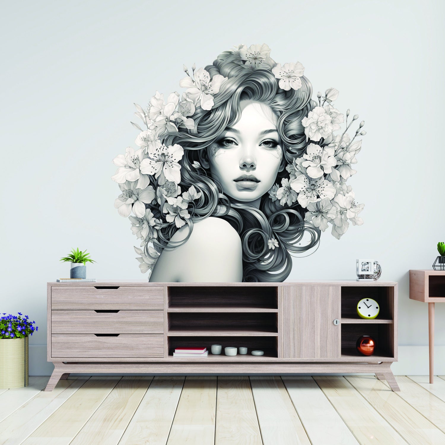 Aufkleber „Elegante Frau mit floralem Geist“ – wohnungsfreundlicher Wandaufkleber aus Vinyl - 8 x 8 inches ist auf Lager und wird versandt, sobald es wieder verfügbar ist
