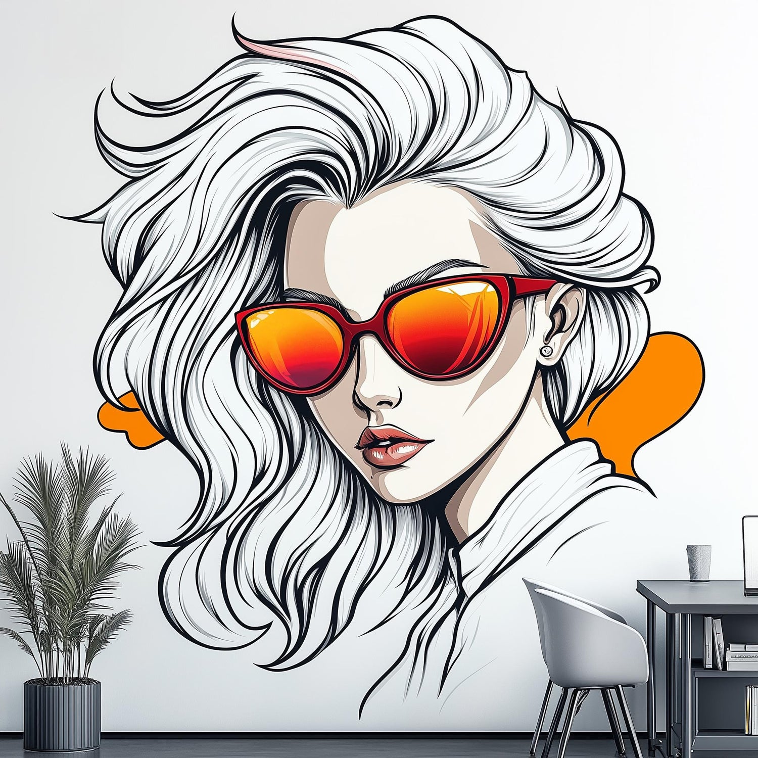 Bring bold energy and style into your space with this sleek wall decal featuring a confident girl with flowing white hair, bright orange sunglasses, and sharp comic-style linework.