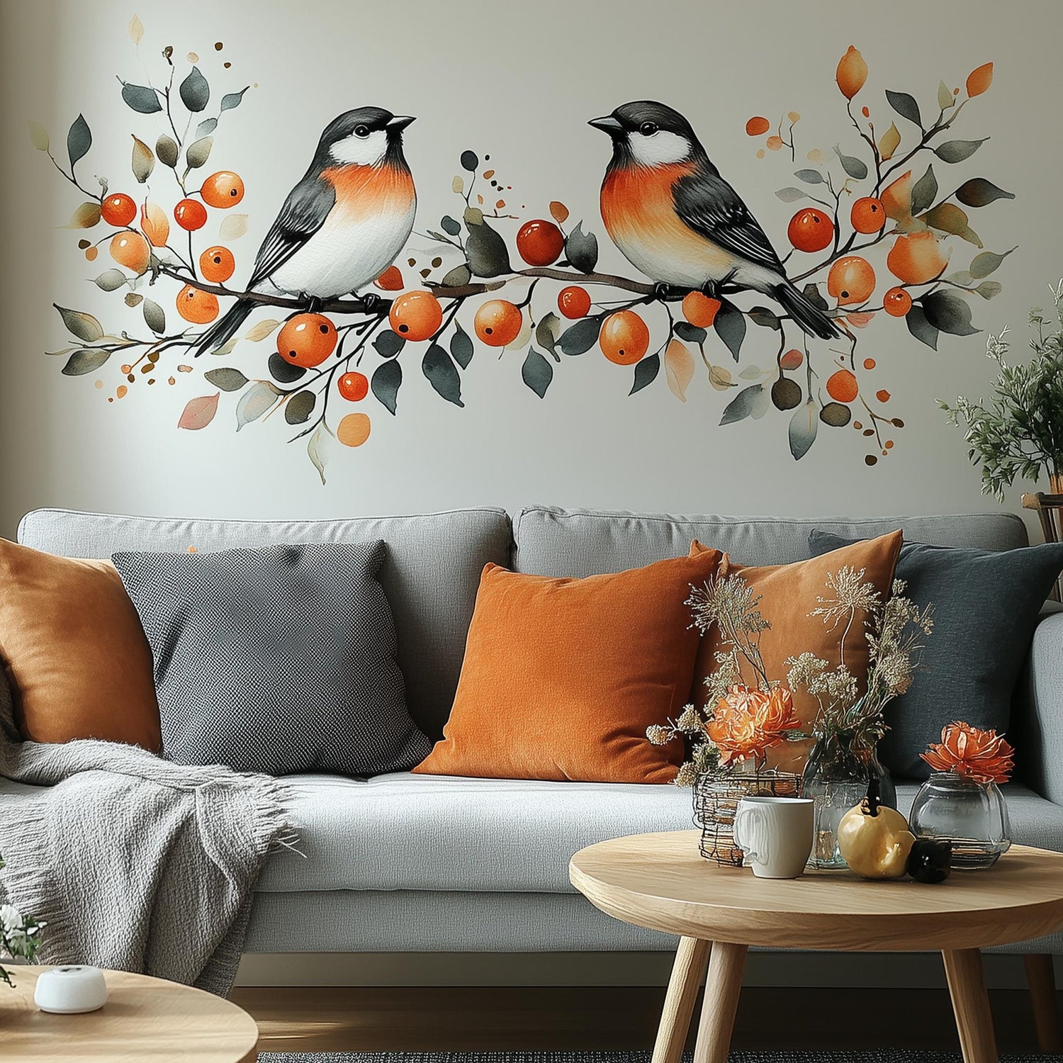 Autumn Bird Wall Decal | Fall Decor Wall Art | Nature-Inspired Bird Sticker | Cozy Living Room Decor | Botanical Mural with Orange Berries