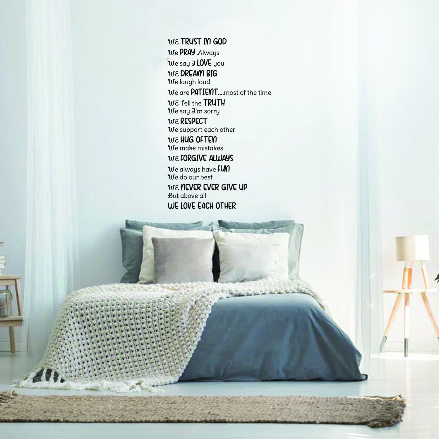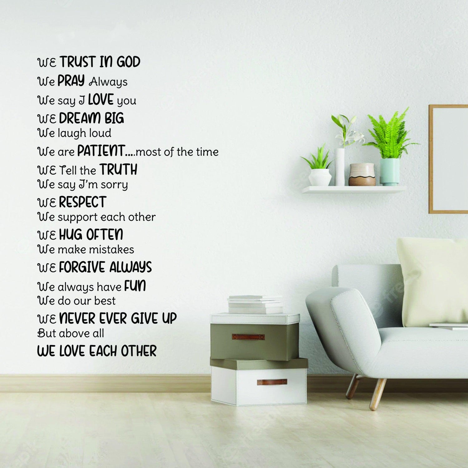 Christian wall vinyl sticker featuring uplifting phrases and Bible quotes in stylish text on a modern living room wall.