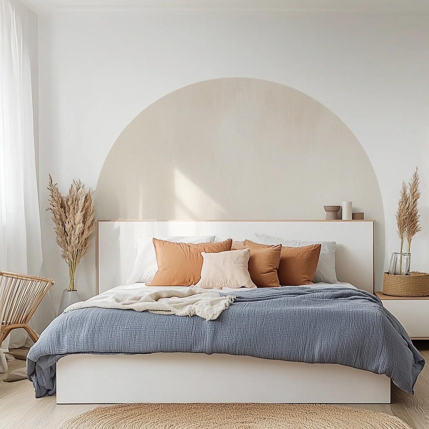 Minimalist Boho bedroom featuring a half-circle wall decal and neutral-toned bedding for a cozy decor.
