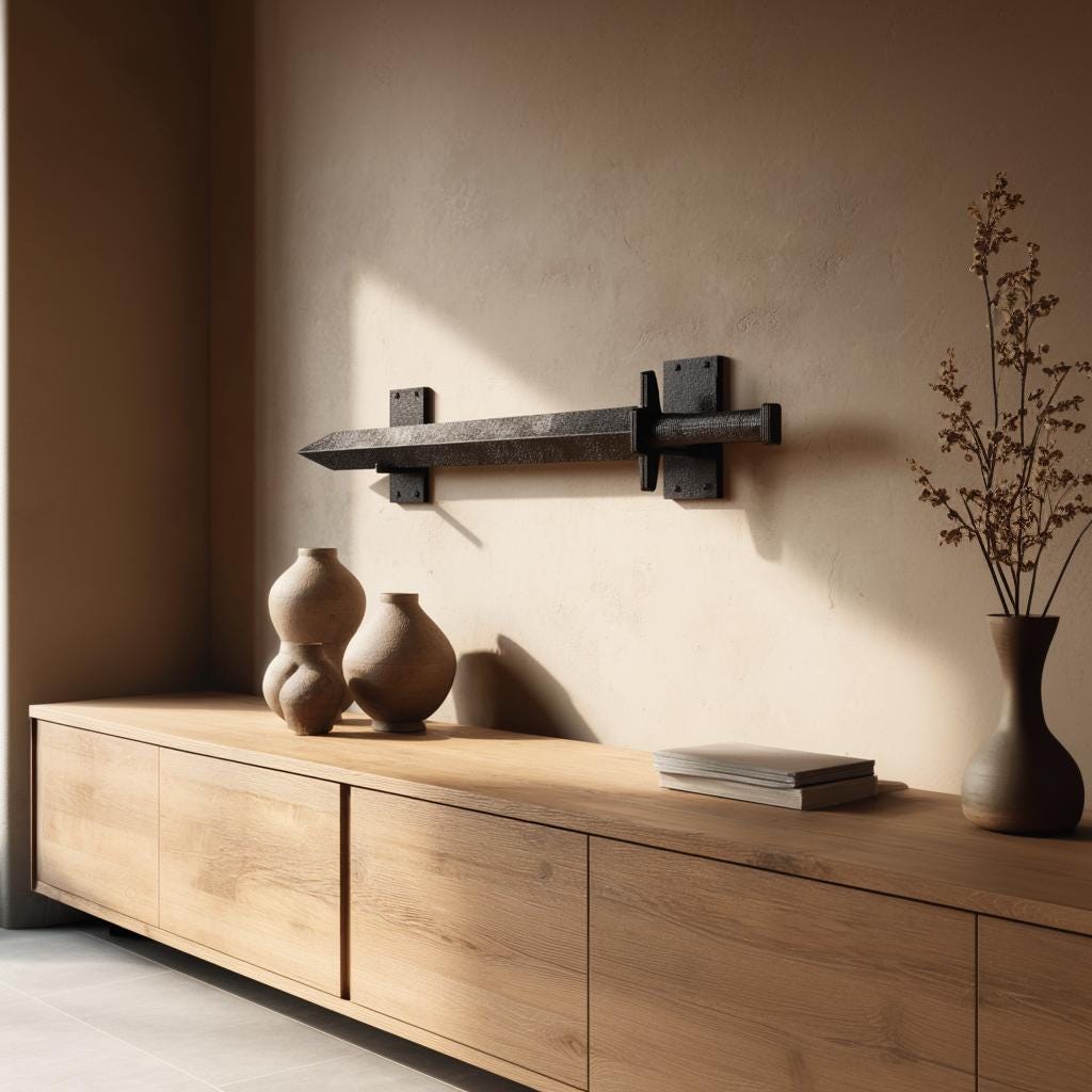 This wall-mounted decorative sword is designed as a modern fantasy accent for your interior. The blade is held horizontally by two separate wall holders, so it looks like a stone-forged relic floating on the wall. The entire sword can be lifted out of the holders, making it easy to take down for cleaning, rearranging or just to admire up close.