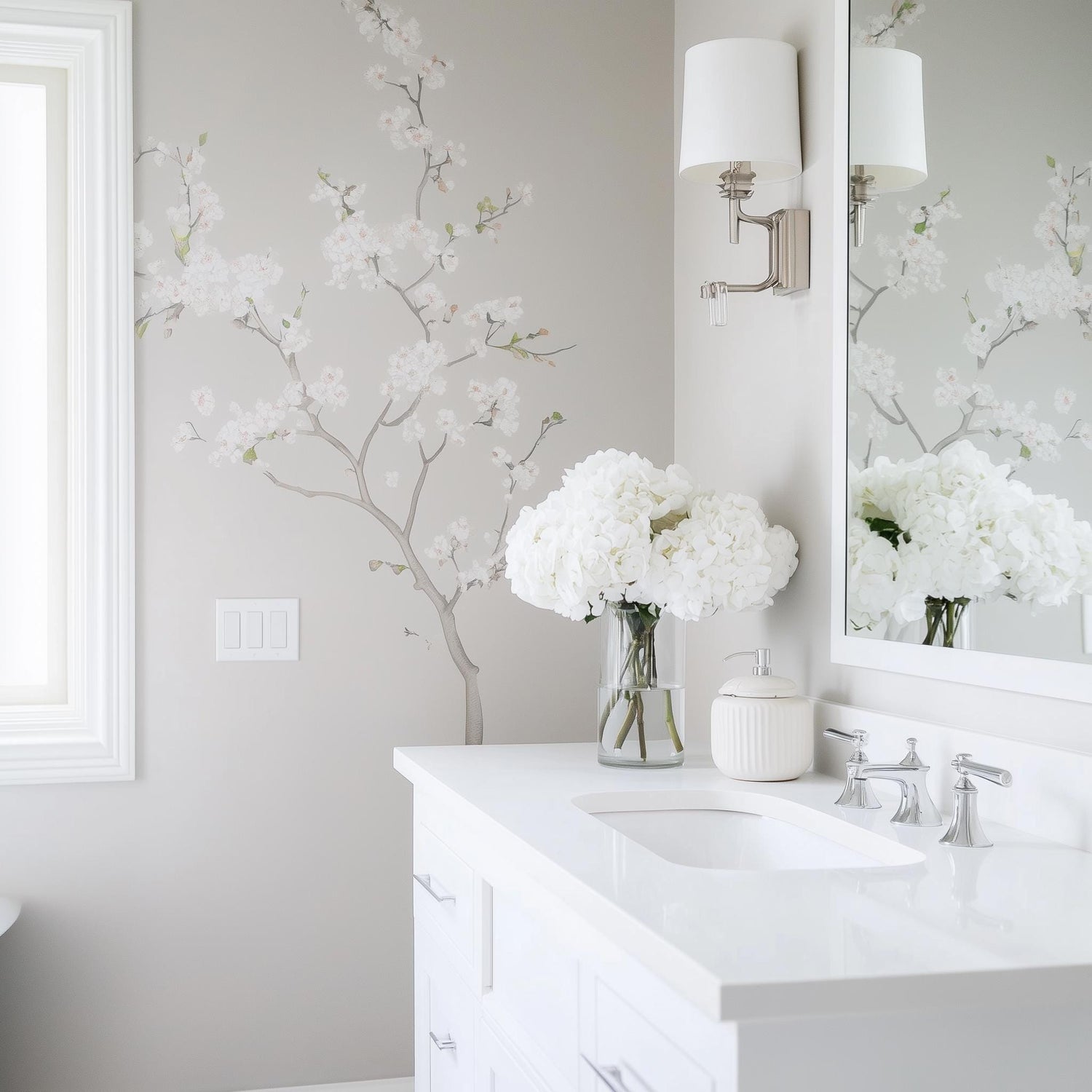 Chinoiserie Blossom seinakleebis | Elegantne lillepuu vinüülkleebis | Helehall botaaniline seinamaaling | Luksuslik vannitoa ja magamistoa sisekujundus