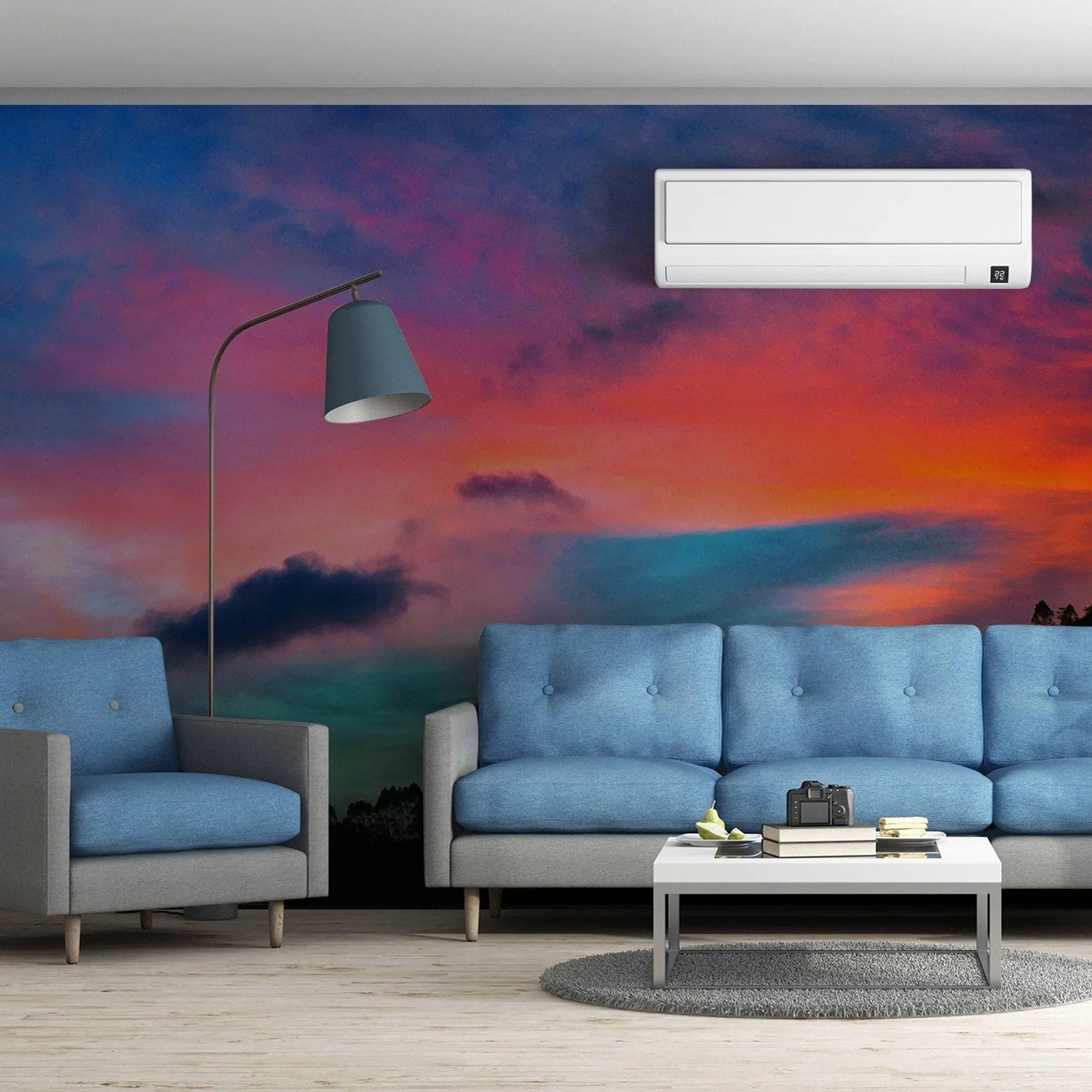 Vibrant sunset wall decals transforming a stylish home interior with a panoramic nature view.