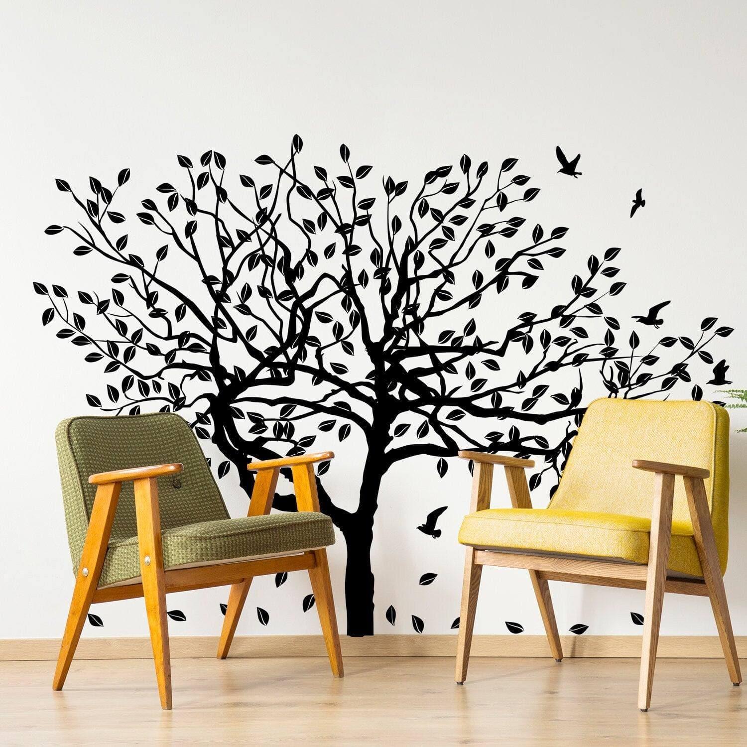 Nature-inspired tree wall decal sticker for home decoration, featuring leaves and birds in black silhouette.