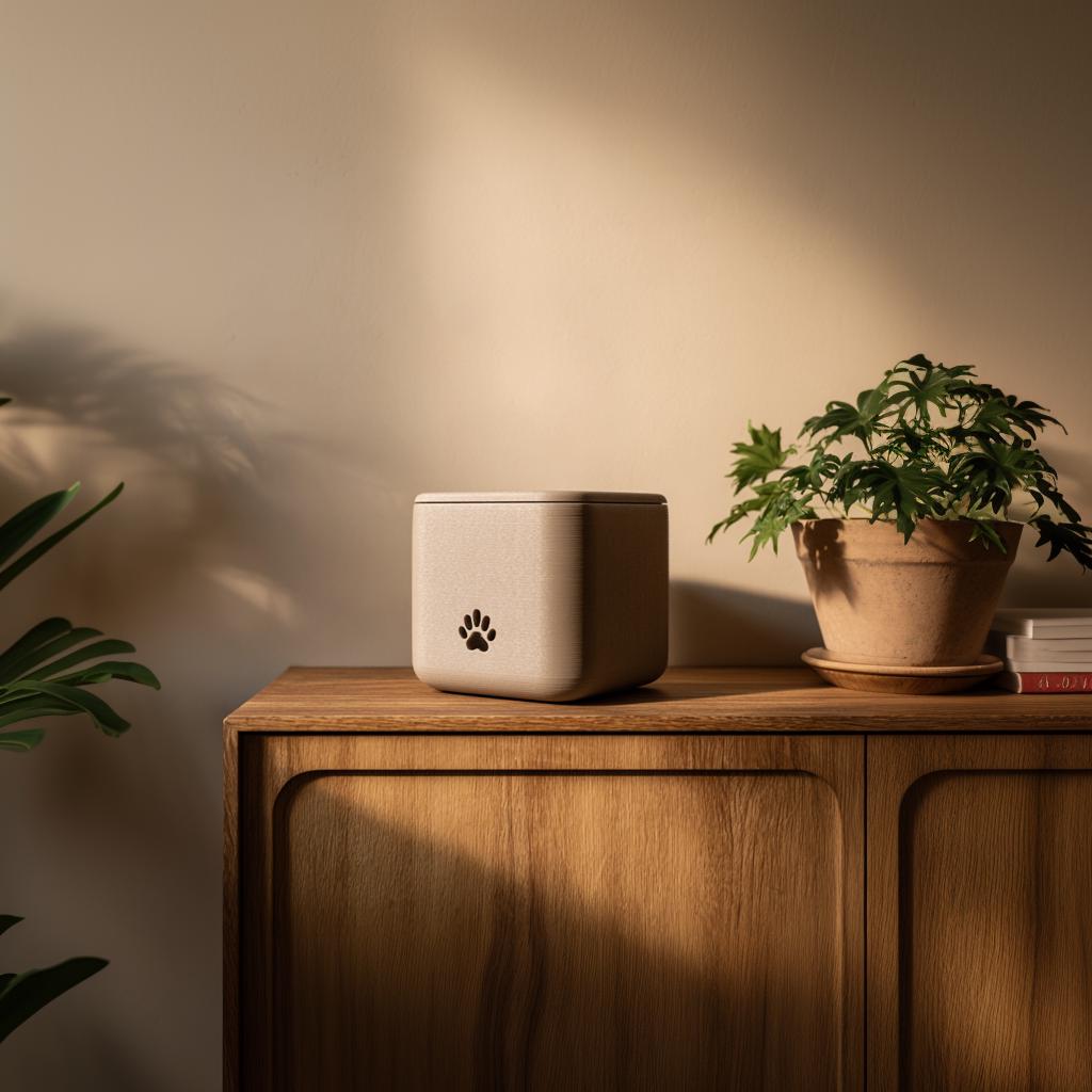 This modern square pet cremation urn is designed as a calm and understated memorial piece for your beloved pet. Its soft-edged cubic form and small recessed paw print create a gentle balance between emotional meaning and contemporary design, making it suitable for modern homes without feeling somber or heavy.
