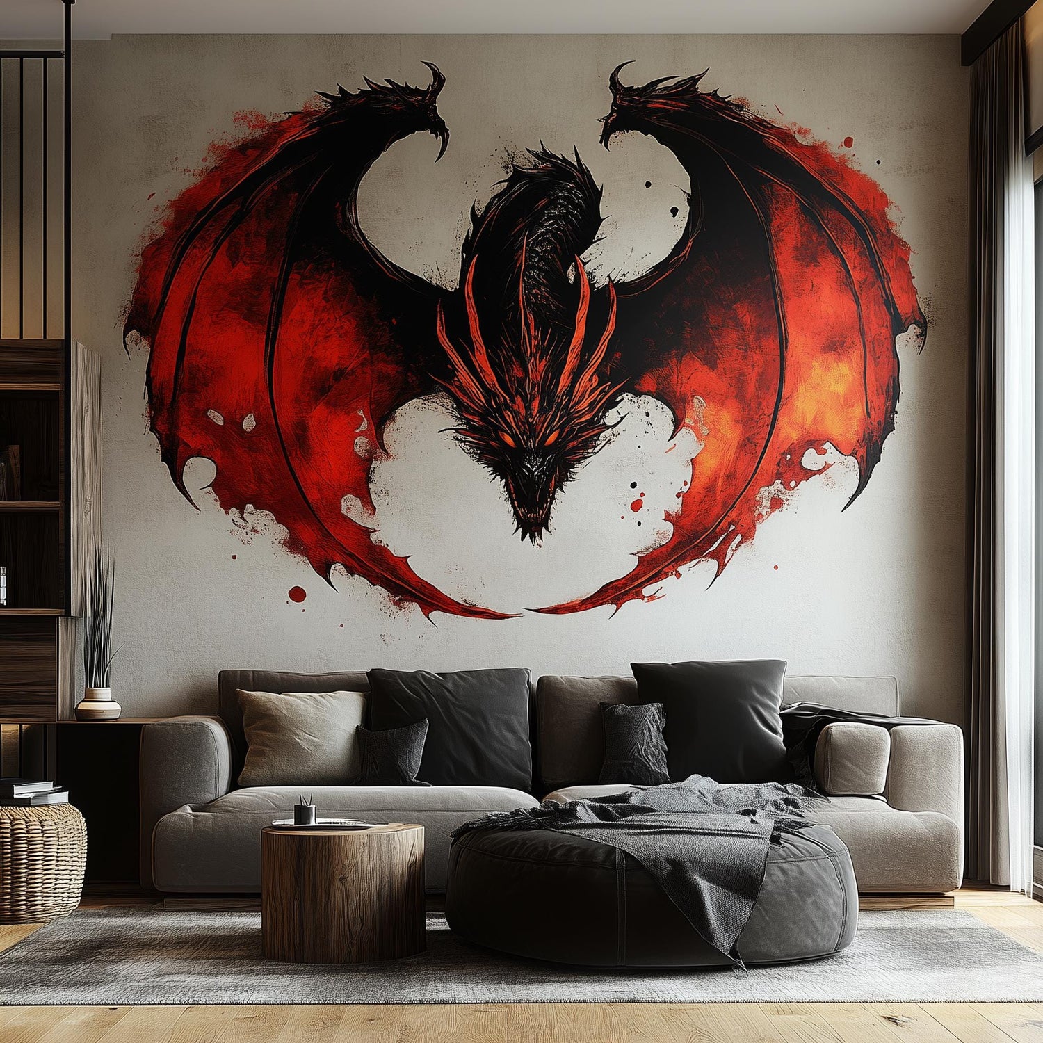 Tulise draakoni seinakleebis | Paks punane must fantaasia seinakunsti kleebis | Elutubade müütiline seinamaaling | Eemaldatavad vinüülkleebised