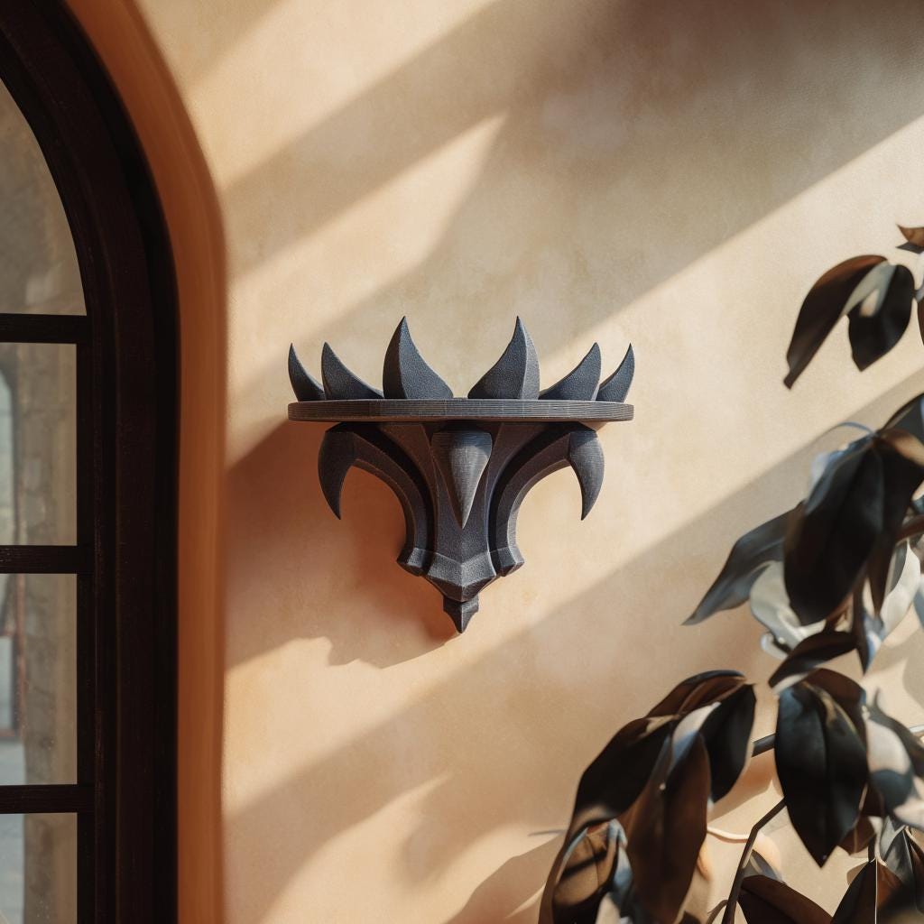 See seinariiul näeb välja nagu väike gooti artefakt, mis on välja võetud fantaasialossist: kompaktne ümar serv, mida toetavad kaardus, küünise moodi ribid ja millel troonivad teravad nikerdatud okkad. See toimib nii praktilise miniriiulina kui ka dramaatilise seinaskulptuurina, sobib suurepäraselt küünla, väikese taime, kristalli või kujukese eksponeerimiseks.