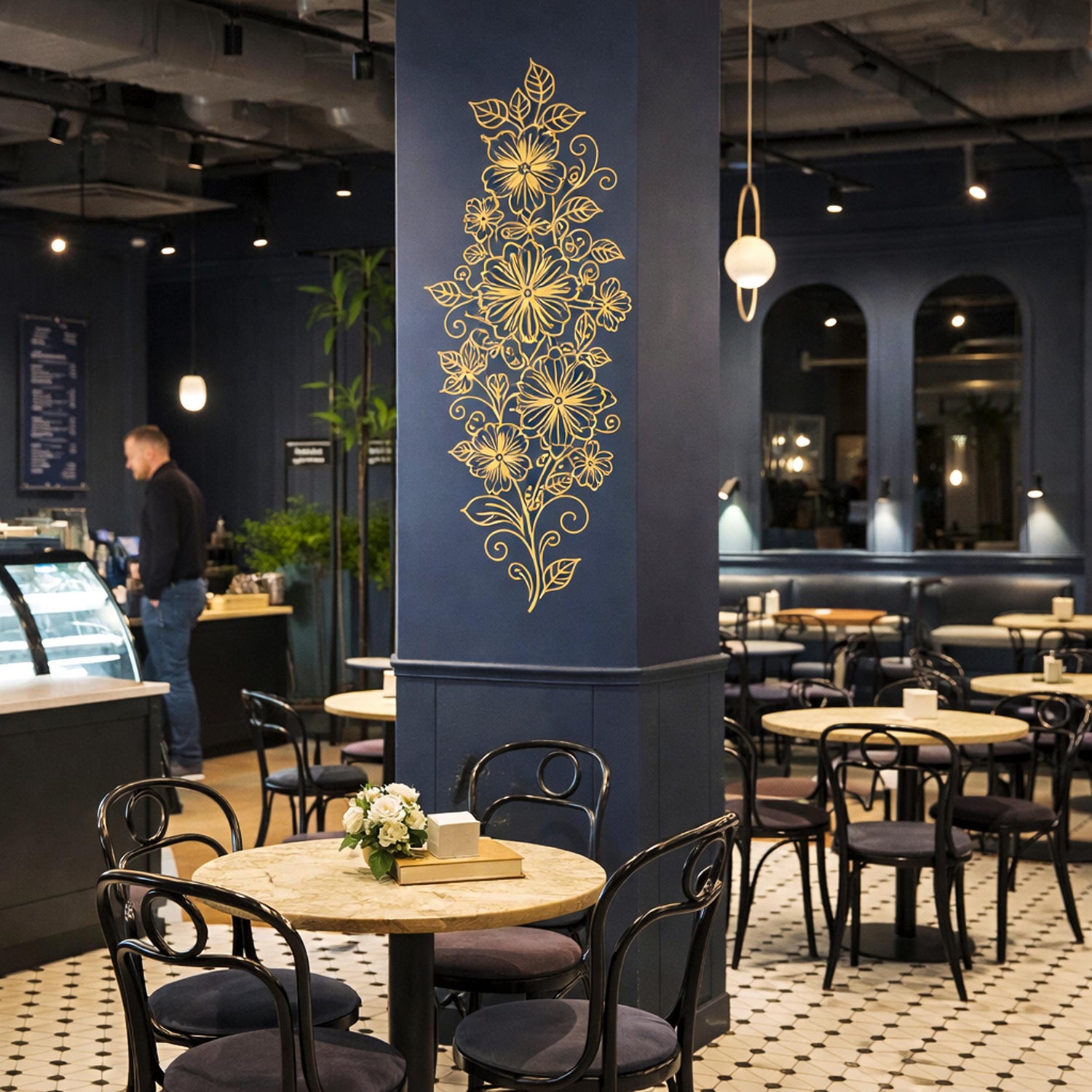 * Detailed Botanical Art: Features a delicate climbing arrangement of flowers, leaves, and swirling vines.