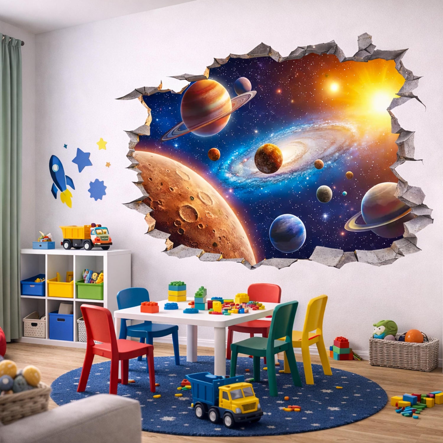 Open a window to the universe directly from your bedroom wall. This stunning 3D breakthrough decal creates the illusion of a jagged portal leading straight into deep space. Featuring a majestic ringed planet, a brilliant sun, and a glowing spiral galaxy, this hyper-realistic cosmic scene turns any ordinary room into an interstellar adventure.