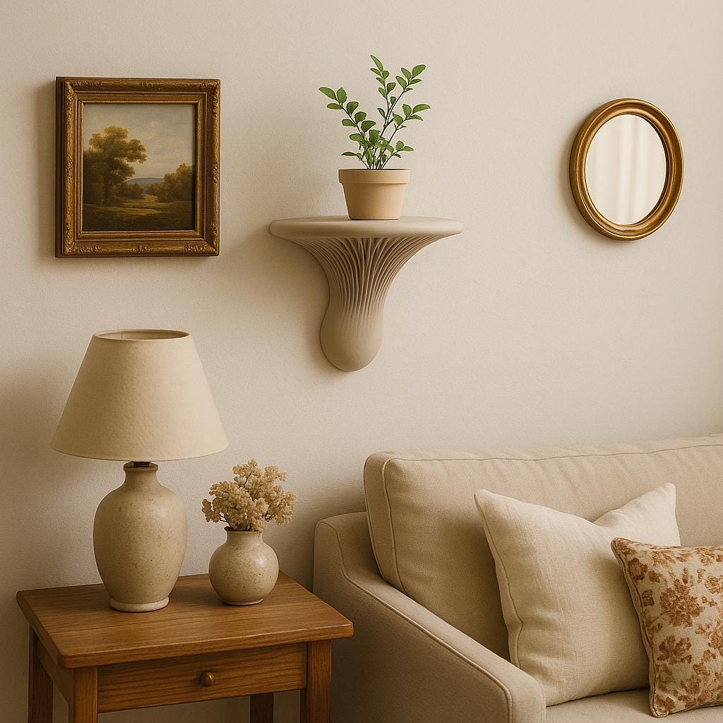 A sculptural wall-mounted shelf in matte beige, 3D printed with elegant vertical ribbing. Shaped like a soft organic curve, it holds a small potted plant and blends into a neutral-toned minimalist interior.
