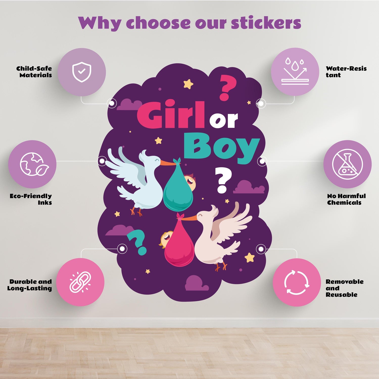 **"Tüdruk või poiss?" seinakleebis** on ideaalne viis fototsooni loomiseks ja oma paljastamisele põnevuse lisamiseks. Ideaalne maagilise hetke jäädvustamiseks ja mälestuste loomiseks, mis jäävad terveks eluks!