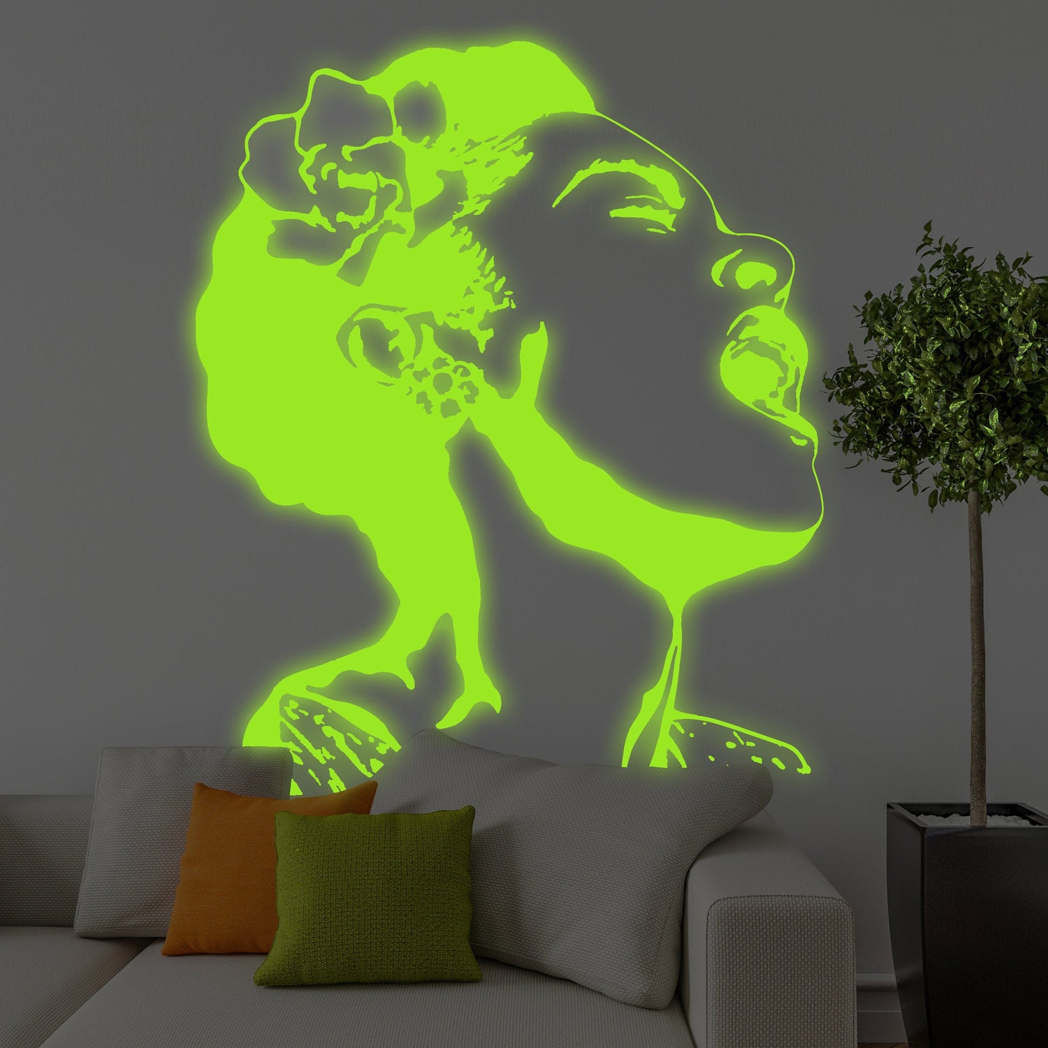 Pimedas helendav elu on ilus Banksy tänavakunsti seinakleebis – öövalgus helendav neoonlaulva naise kleebis