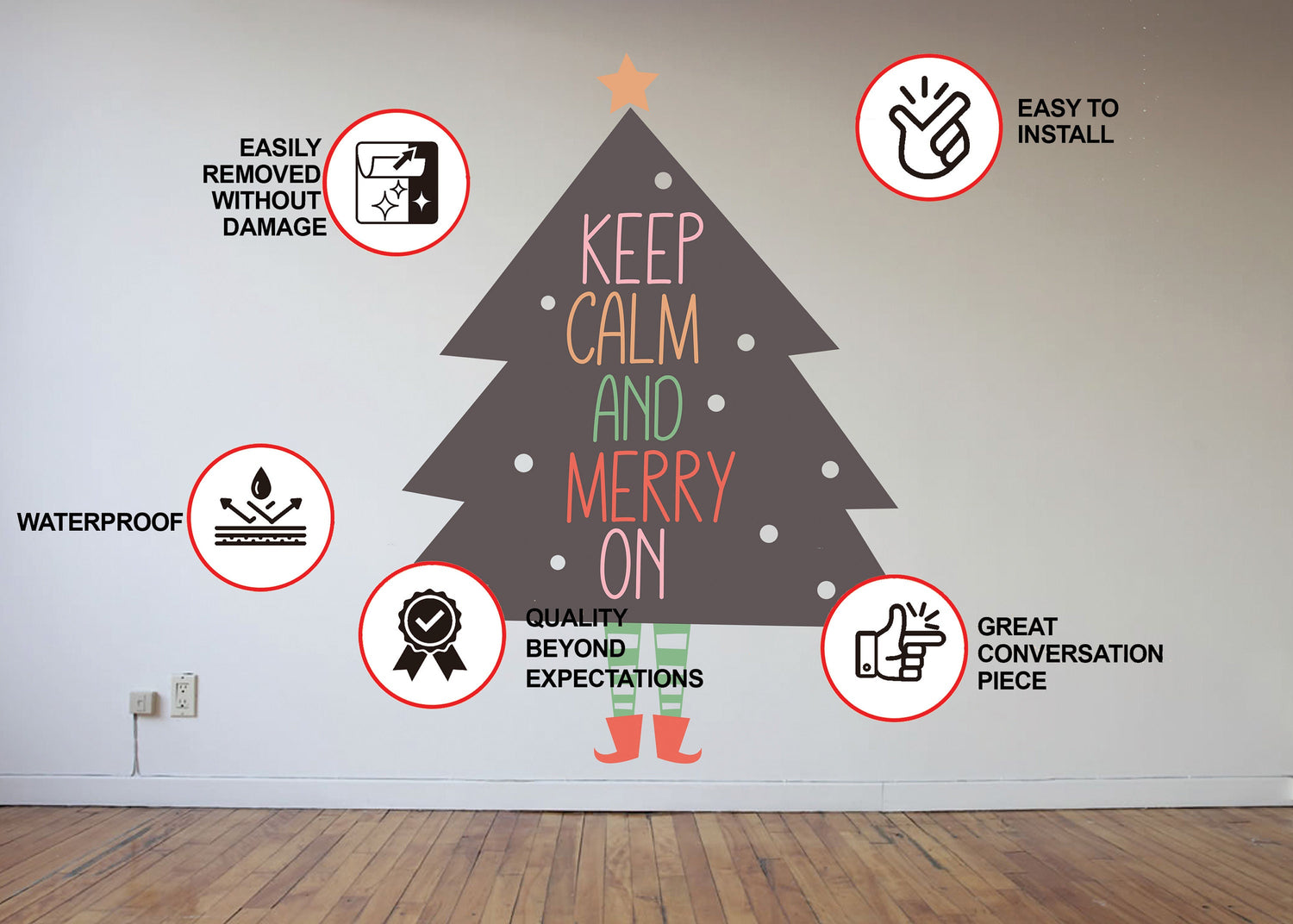 Astuge veidra rõõmumaailma meie naljaka jalgadega jõulupuuga seinavinüülkleebise abil, millel on meeleolukas sõnum "Olge rahulik ja rõõmsad". See mänguline ja värviline tekstikleebis sobib suurepäraselt teie elutoa sisustusse huumori ja inspiratsiooni lisamiseks, muutes pühadehooaja veelgi nauditavamaks.
