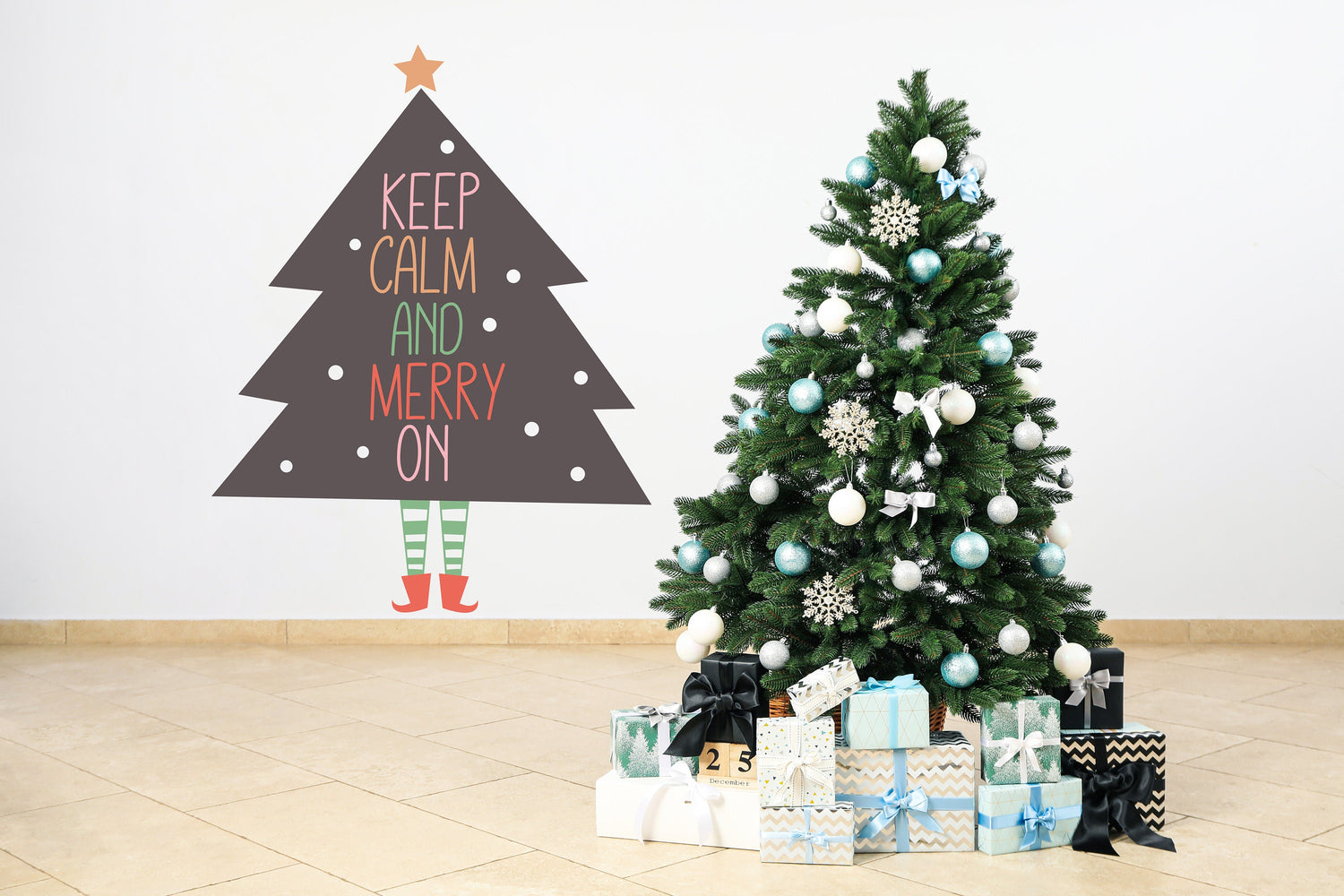 Eriskummaline jalgadega jõulupuu seinavinüülkleebis – värvilise tekstiga kleebis Merry On