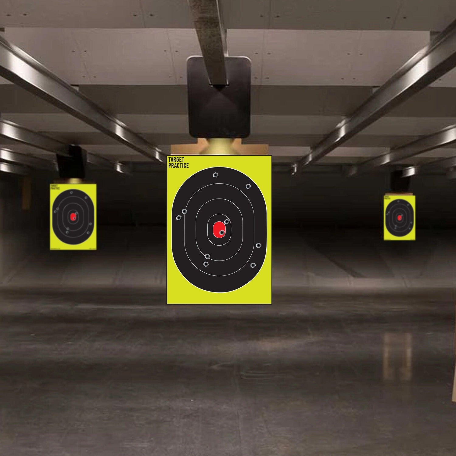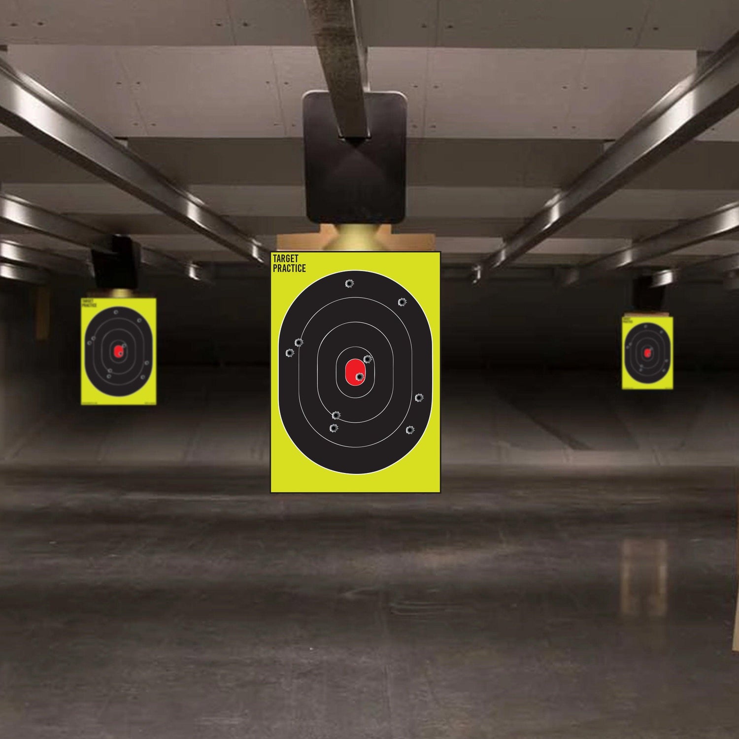 Range shooting targets on a firing range for gun practice, featuring large circles and bright yellow backgrounds.