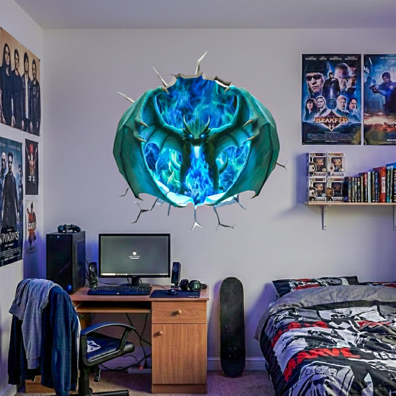 Unleash the power of a mythical beast in your home with this breathtaking 3D Blue Fire Dragon decal. This isn’t just a sticker; it’s a portal into a world of magic and fire, designed to look as if a legendary dragon is bursting through your very walls. The striking contrast of the deep teal scales against the intense neon-blue flames creates a visual experience that is both intimidating and awe-inspiring.