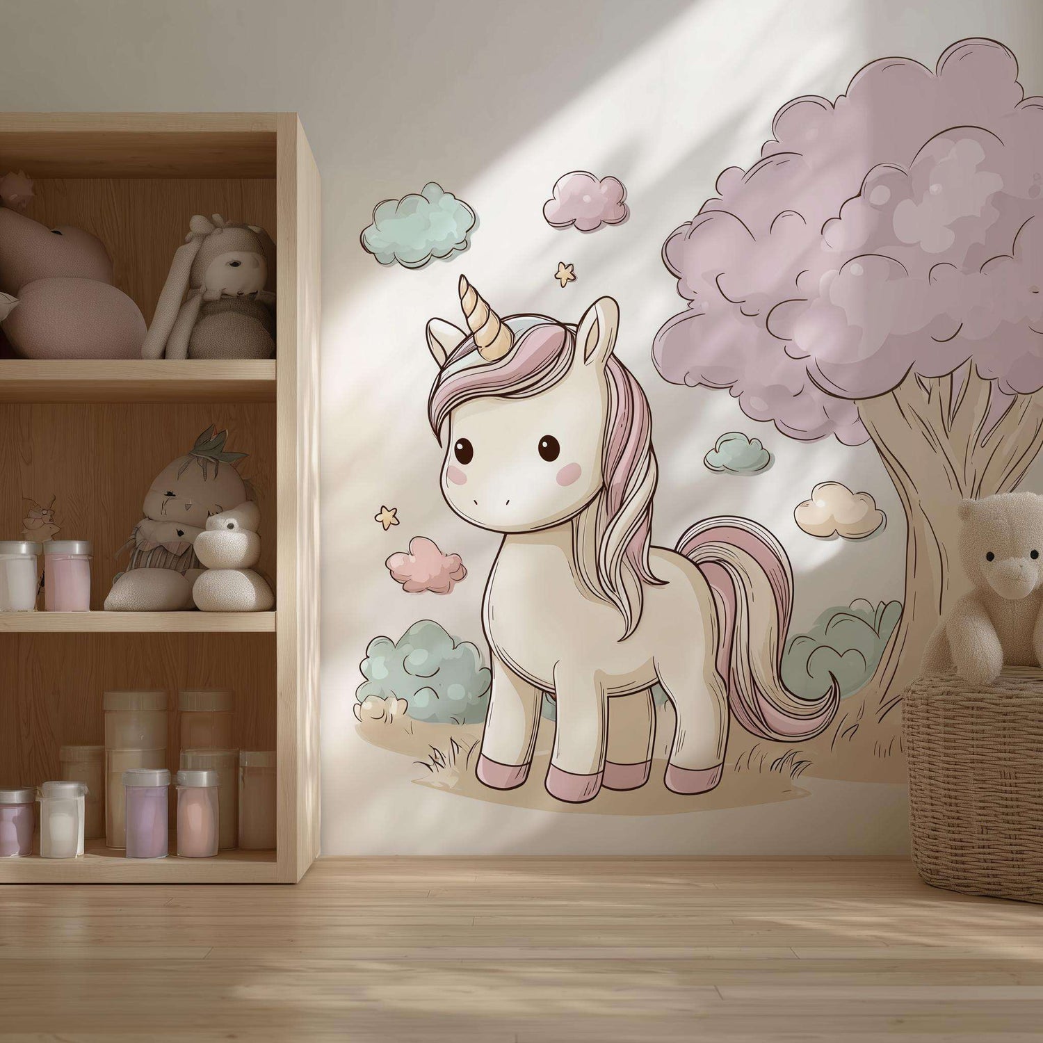This charming pastel decal features a sweet cartoon-style unicorn with soft pink and cream tones, standing beside a whimsical tree and surrounded by fluffy clouds and stars. It’s the perfect wall accent for nurseries, girls’ bedrooms, or play areas.