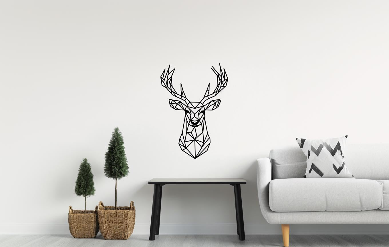 Bring a bold, modern touch to your space with this **geometric deer wall decal sticker**. Featuring a striking, angular design of a deer with antlers, this decal is perfect for living rooms, bedrooms, offices, or any space in need of a sleek and minimalist statement piece.