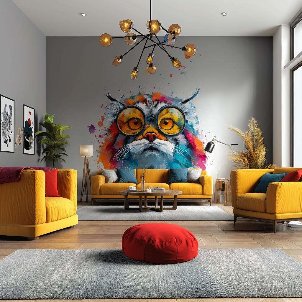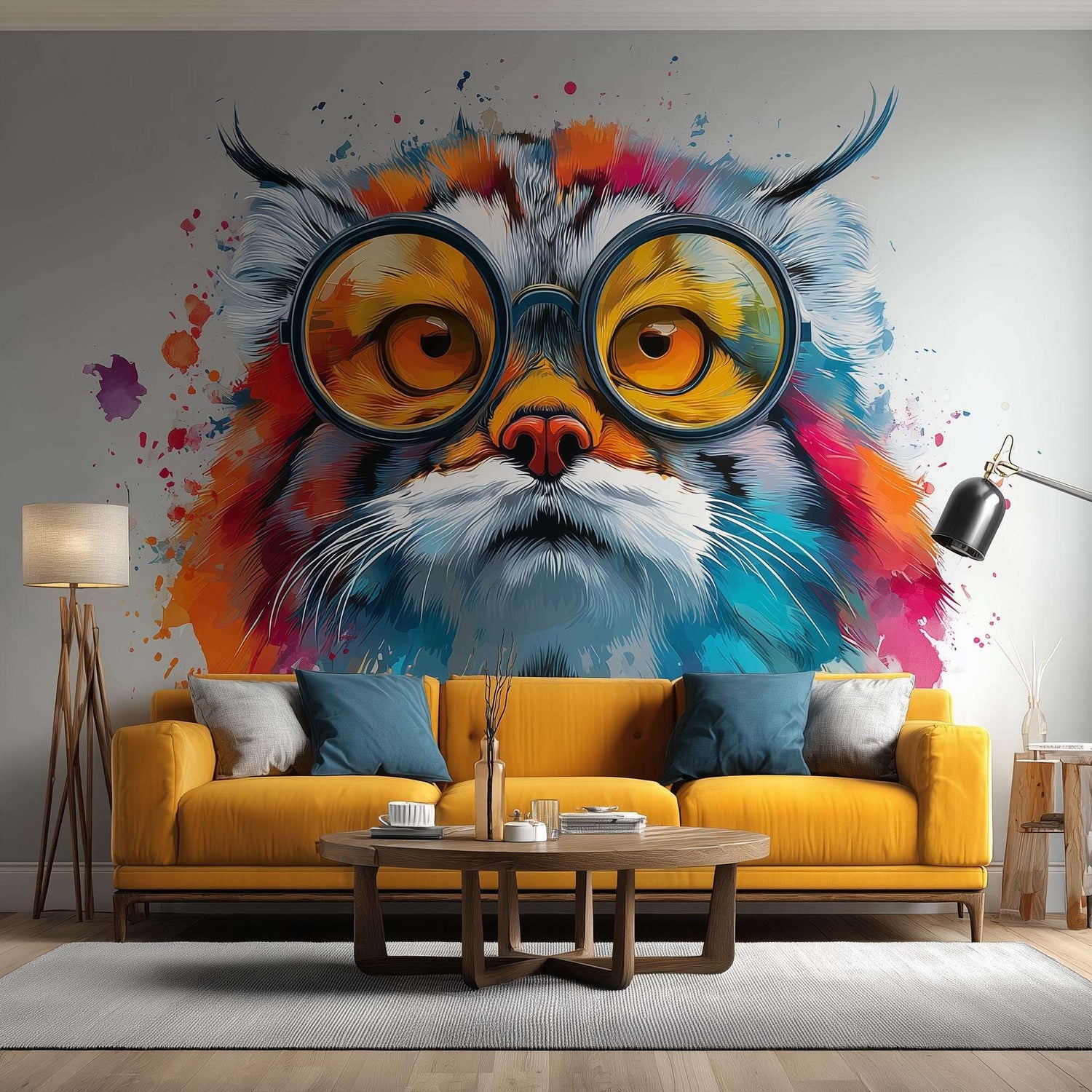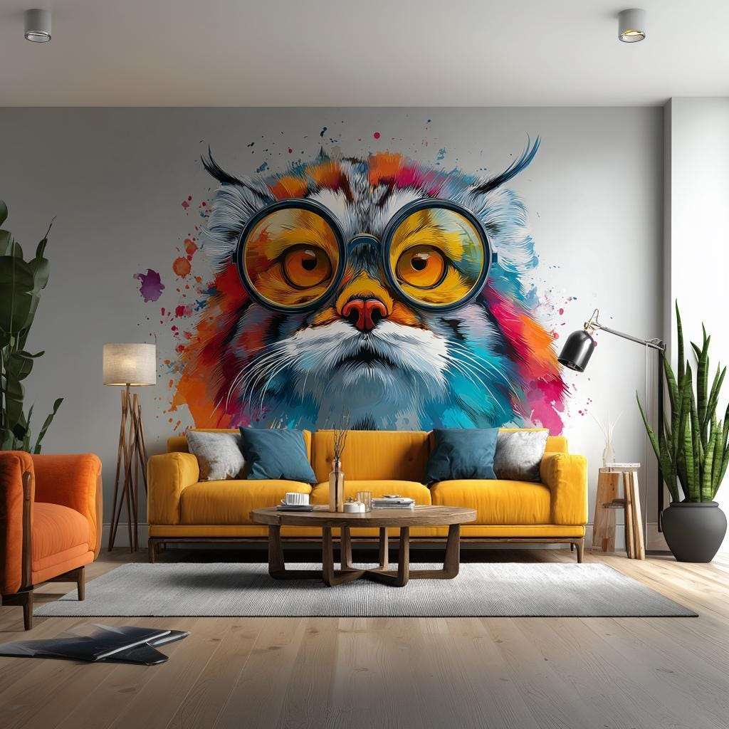This vibrant wall decal features a whimsical Pallas’s cat (Manul) wearing oversized sunglasses, surrounded by bold paint splashes for a striking and modern look. Perfect for creative interiors, this design instantly energizes any room with color and personality.