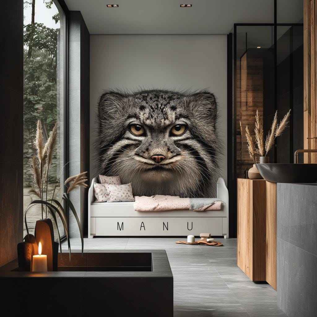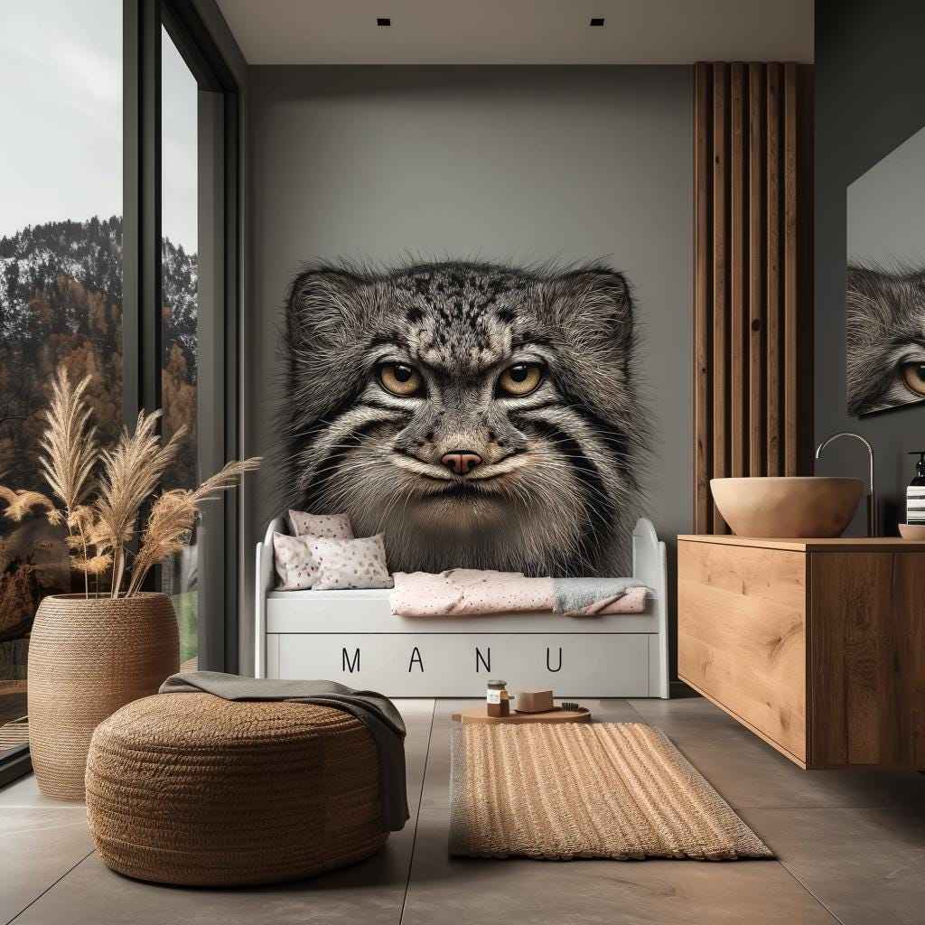Create a bold and unforgettable accent wall with this realistic wall decal of a Pallas’s cat (Manul). The high-detail artwork captures the wild elegance and intensity of this elusive feline, making it a perfect centerpiece for bedrooms, creative spaces, or nature-themed interiors.