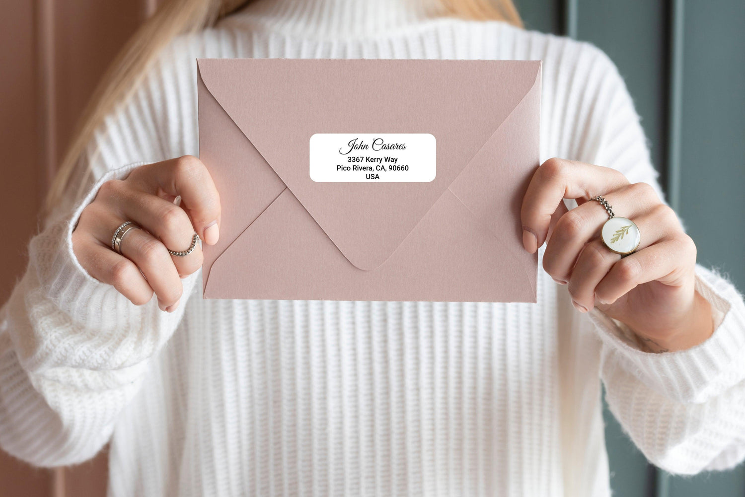 Custom clear mailing label on a pink envelope, featuring personalized address for stylish postage.